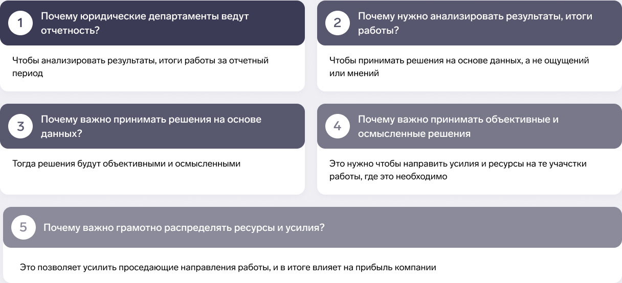 Абсолютные величины не информативны. Отчет, в котором данные можно сравнивать, позволяет руководителю грамотно распоряжаться ресурсами, показывать рост нагрузки на своих сотрудников и результативность юридического отдела в целом.